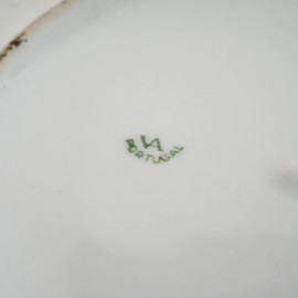 Zuppiera con coperchio in porcellana dorata con decori floreali e festoni, completa di sottopiatto, misura max cm 18x28x18