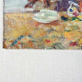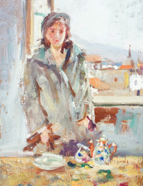 Alla finestra, XX secolo, olio su tavoletta, cm 17x11, entro cornice