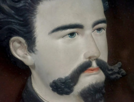 Altorilievo raffigurante il ritratto di Ludovico II di Baviera, entro bacheca in legno con vetro decorato, XIX secolo, cm 73x56 (difetti)