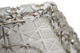 Alzata in vetro molato con struttura in metallo poggiante su quattro piedini, XX secolo, cm 10,5x40x18, (difetti)