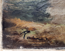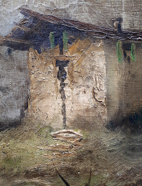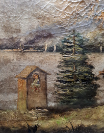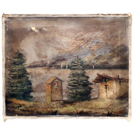 Artista dell’800, paesaggio lacustre con alberi casale e tempietto, olio su tela, cm 40x50, firmato in basso a sinistra