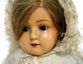 Bambola in materiali vari, occhi in vetro, fine XIX secolo, altezza cm 83