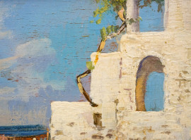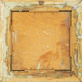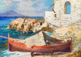Barca sulla costa, olio su tavoletta, cm 16x16, firmato in basso a destra, entro cornice