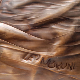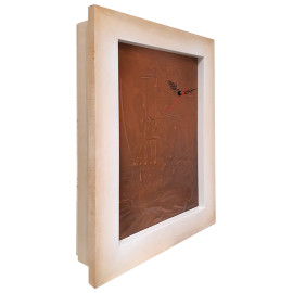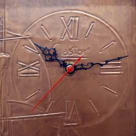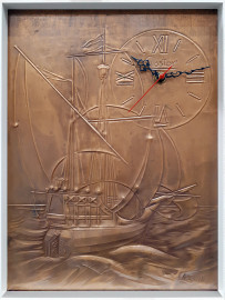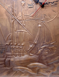 Bassorilievo vintage in rame lavorato a sbalzo raffigurante caravella, firmato, in alto a destra riporta quadrante di orologio con meccanismo funzionante ma da revisionare