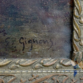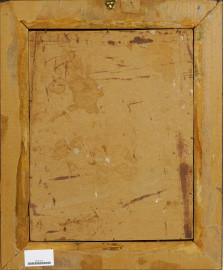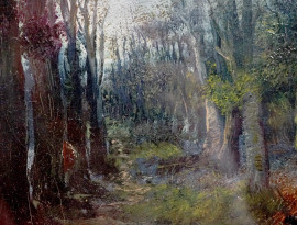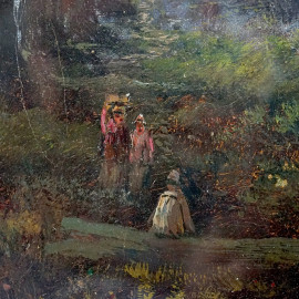 Bosco con viandanti, olio su tela riportata su cartone, firmato, cm 41x32, entro cornice