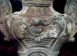 Bouquet di fiori artificiali in stoffa con finto vaso in metallo dorato, XX secolo, entro bacheca con cornice in legno e stucco dorato, cm 44x44