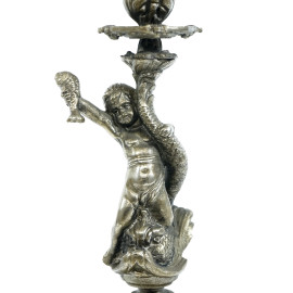 Candeliere montato a lume in metallo dorato con fusto a foggia di putto marino, su base quadrangolare in alabastro poggiante su 4 piedini in metallo, XX secolo, altezza cm 75 (difetti)