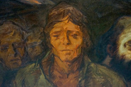 Lavoratori, olio su tela, firmato, cm 123.5x142