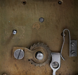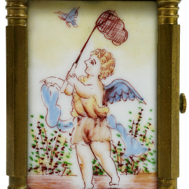 Cappuccina in metallo dorato e porcellana policroma con scene raffiguranti dei putti che giocano, XX secolo, cm 8,5x6x5,3 (difetti e meccanismo da revisionare)