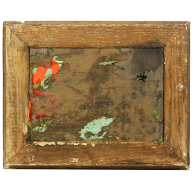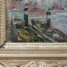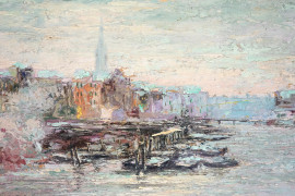 Città fluviale, olio su cartone, cm 20x28,5, firmato in basso a sinistra, entro cornice