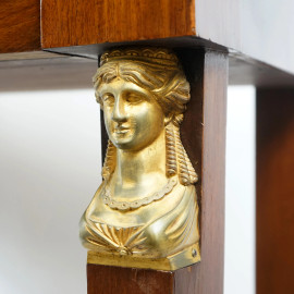 Consolle francese stile impero in piuma di mogano con piano rettangolare in marmo, montanti anteriori con busti femminili bronzei, XX secolo, cm 117x116x45,5, (difetti)