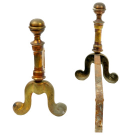 Coppia di alari in metallo dorato e ferro, XX secolo, cm 27x35x15 (difetti)