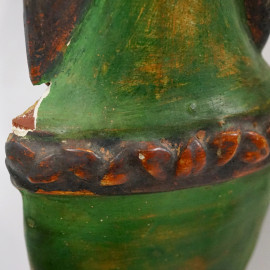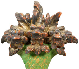 Coppia di appliques a tre bracci, in legno policromo nei toni del verde, dell'oro e del bruno, intagliato con cartella a foggia di vaso coronato da fiori e irradiante racemi, XX secolo, cm 79x42, (difetti)