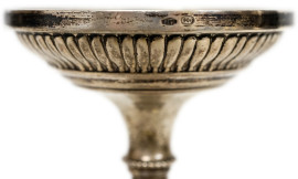 Coppia di candelieri in argento con decori cesellati e sbalzati, XX secolo, peso gr. 240, altezza cm 19,5 (difetti)