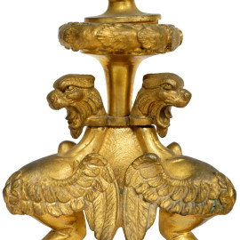 Coppia di candelieri in bronzo dorato cesellato con con leoni alati alla base e tre piedini ferini, XIX secolo, altezza cm 55, (difetti)