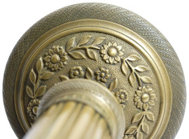 Coppia di candelieri in metallo dorato con decori cesellati, fusto scanalato e base circolare a motivi floreali, XX secolo, altezza cm 28