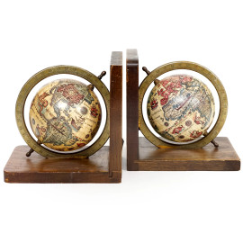 Coppia di fermalibri in legno con mappamondo rivestito in carta stampata, XX secolo, cm 17,5x17,5x12