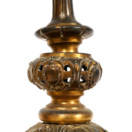 Coppia di lampade in bronzo dorato e cesellato a motivi floreali con base circolare e paralume in carta nero-oro, XX secolo, altezza cm 45,5, (difetti)