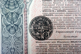 Coppia di obbligazioni bancarie russe, 1906, cm 40x31, (difetti)
