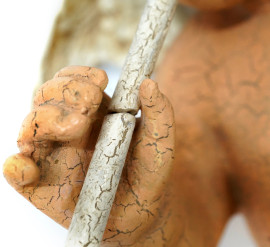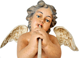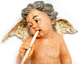 Coppia di putti musicanti da parete in resina dipinta, XX secolo, misure massime cm 62x37x36,5, (difetti)