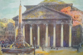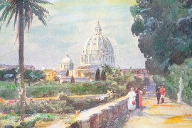 Coppia di stampe colorate su carta raffiguranti vedute di Roma, XIX-XX secolo, cm 11x18, entro cornice