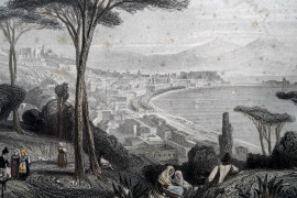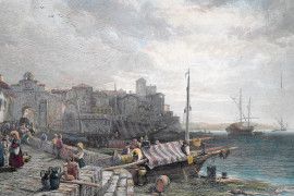 Coppia di stampe raffiguranti vedute di Mola e Napoli, XIX secolo, misure comprese passepartout cm 22x30, entro cornice (difetti)