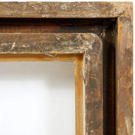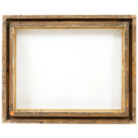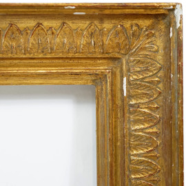 Cornice in legno dorato e intagliato con decoro a palmette, XX secolo, ingombro 64,5x53, battente cm 53x41, (difetti)