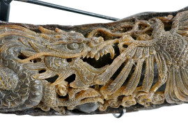 Corno di bue intagliato con decori a foggia di draghi, inizi XX secolo, lunghezza cm 39