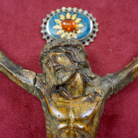 Cristo, XX secolo, legno dorato e pietre varie, entro cornice, cm 26x18,5, (difetti)