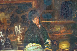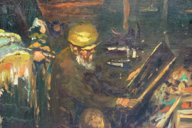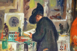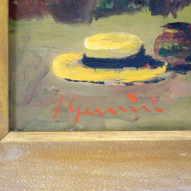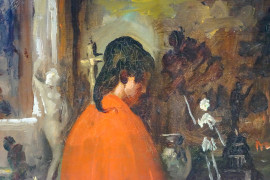 Dall'antiquario, XX secolo, olio su masonite, cm 65x41,5, firmato in basso a sinistra, entro cornice