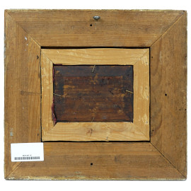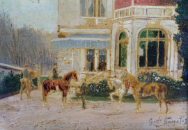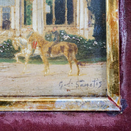 Esterno con cavalli, XIX secolo, olio su tavoletta, cm 10x14, firmato, entro cornice, (diifetti)