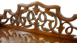 Etager in radica di noce a tre scaffali, con fronte mosso, coronamento intagliato a traforo e colonne ad andamento tortile, XX secolo, cm 100x54,5x34,5, (difetti)