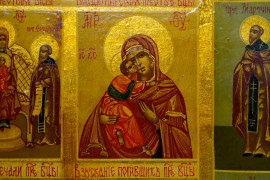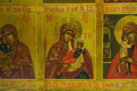 Icona raffigurante diverse immagini della Vergine, tempera su tavola, XX secolo, cm 32x28,5