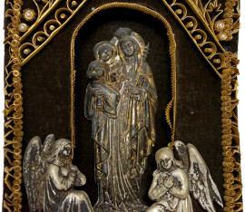 Icona raffigurante la Madonna con il Bambino tra due angeli in metallo, carta e legno, XX secolo, cm 27x13 (difetti)