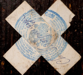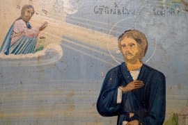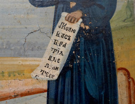 Icona russa, tempera su tavola entro teca in legno, inizio XX secolo, misure totali cm 30x25x7, (difetti)