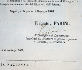 Il Luogotenente Generale del Re nelle provincie napoletane, 3 gennaio 1861, cm 50,5x38,5, entro cornice