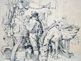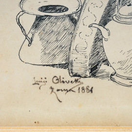Il mercante, matita e inchiostro su carta, firmato e datato "Luigi Olivetti Roma 1884" in basso a sinistra, misure comprese passepartout cm 30x25,5, entro cornice