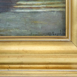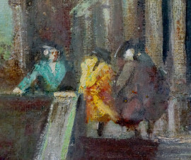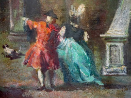 Imitatore di Francesco Guardi (Venezia, 1712 – 1793), Dame e gentiluomini all'ingresso di una villa, olio su cartoncino, cm 40x31, entro cornice