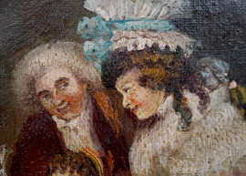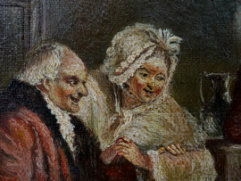Interno con figure, olio su tela, misure comprese passepartout cm 37x30, entro cornice (difetti)