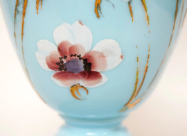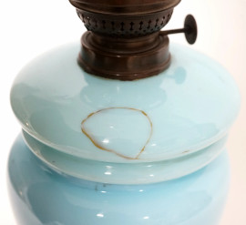 Lampada da tavolo a petrolio in opalina turchese, con decori floreali dipinti in policromia, inizio XX secolo, altezza cm 59, (difetti)