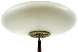 Lampada da tavolo con base in vetro satinato, fusto liscio in legno e bobeche in vetro lattimo, produzione Arteluce, Modello Pao T1, designer Matteo Thun, 1993, altezza cm 54, (difetti)