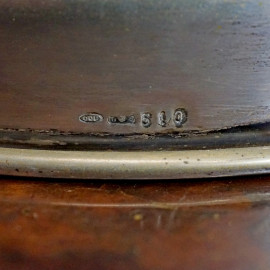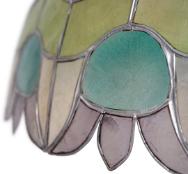 Lampada da tavolo in argento a corpo liscio e base circolare, motivi a foglie nella fascia inferiore del fusto, paralume policromo, XX secolo, altezza cm 42, peso lordo gr 2340, (difetti)