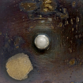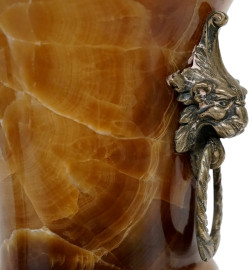 Lotto composto da due coppe piccole e da una coppa grande fiancheggiata da teste leonine, in onice e argento cesellato e sbalzato a foglie poggiante su quattro piedini leonini, altezza massima cm 21, (difetti)