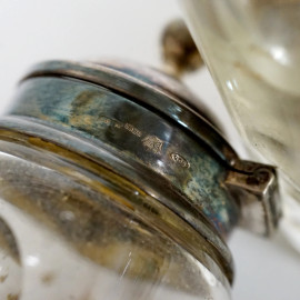 Lotto composto da due oliere in cristallo e da quattro porta spezie in cristallo e argento, XX secolo, altezza massima cm 19, (difetti)