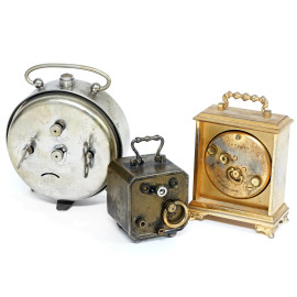 Lotto composto da tre orologi sveglia di manifatture e epoche diverse, misure massime cm 11x9 (difetti e meccanismo da revisionare)