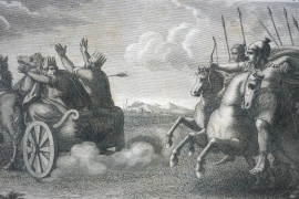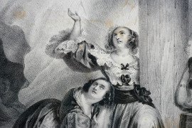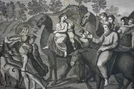 Lotto composto da tre stampe, XIX secolo: "Enrichetta d'Inghilterra", "Giacobbe ritorna in Canaan colla sua famiglia", "Fine infelice di Goram re d'Israele", max cm 45x31, entro cornice, (difetti)