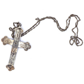 Lotto composto da una collana e un ciondolo a forma di croce in argento con decori cesellati e una pietra nera (ciondolo cm 7x4, lunghezza collana cm 50) e un porta cerini in argento, XX secolo, cm 5,5x6, peso tot gr. 64