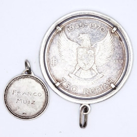 lotto composto da una medaglia in argento "circolo del tennis vomero a. xii/ franco muniz" e una moneta "750 rupiah, 1945-1970" con montatura in argento, diametro cm 5, gr 45,5