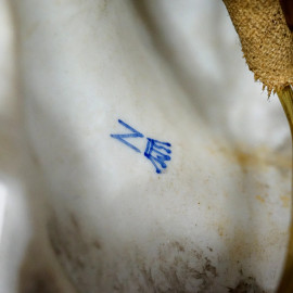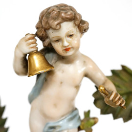 Lume in ceramica policroma a due luci, decori a motivi floreali con putto al centro che suona una campanella, Capodimonte, XX secolo, cm 30x31