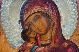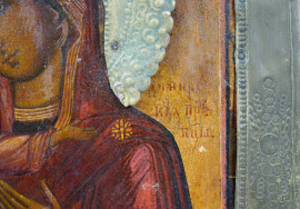 Madonna con il Bambino, riza in metallo argentato, Russia, olio su tavola, fine XIX secolo, cm 31x27,5